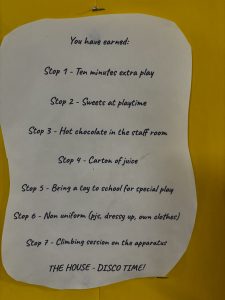Each week, the children are able to collect house points for good behaviour, good work, being friendly and polite to other children and adults. Points can be collected at dinner time, playtime and lesson time.